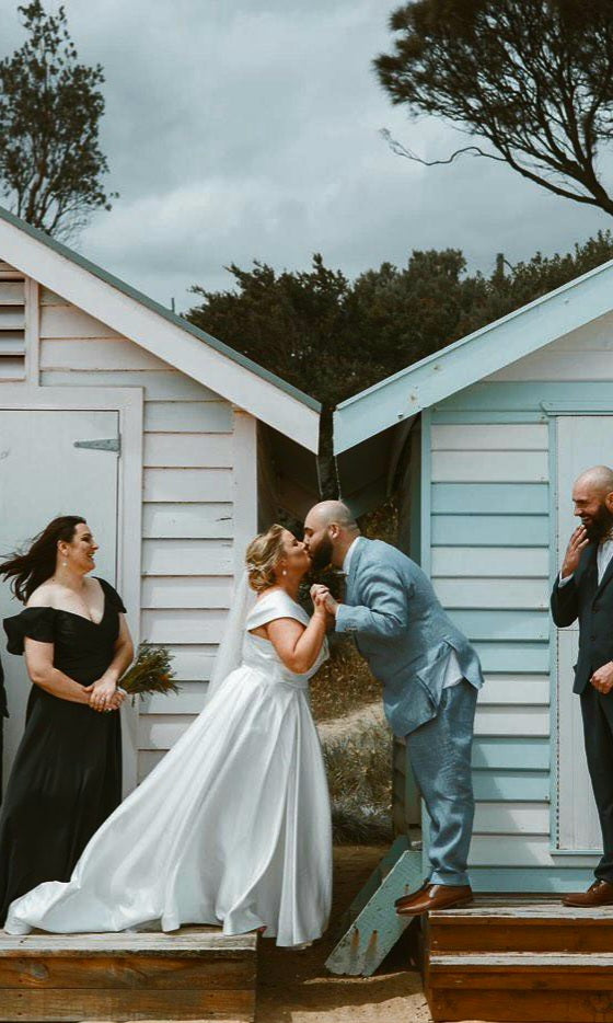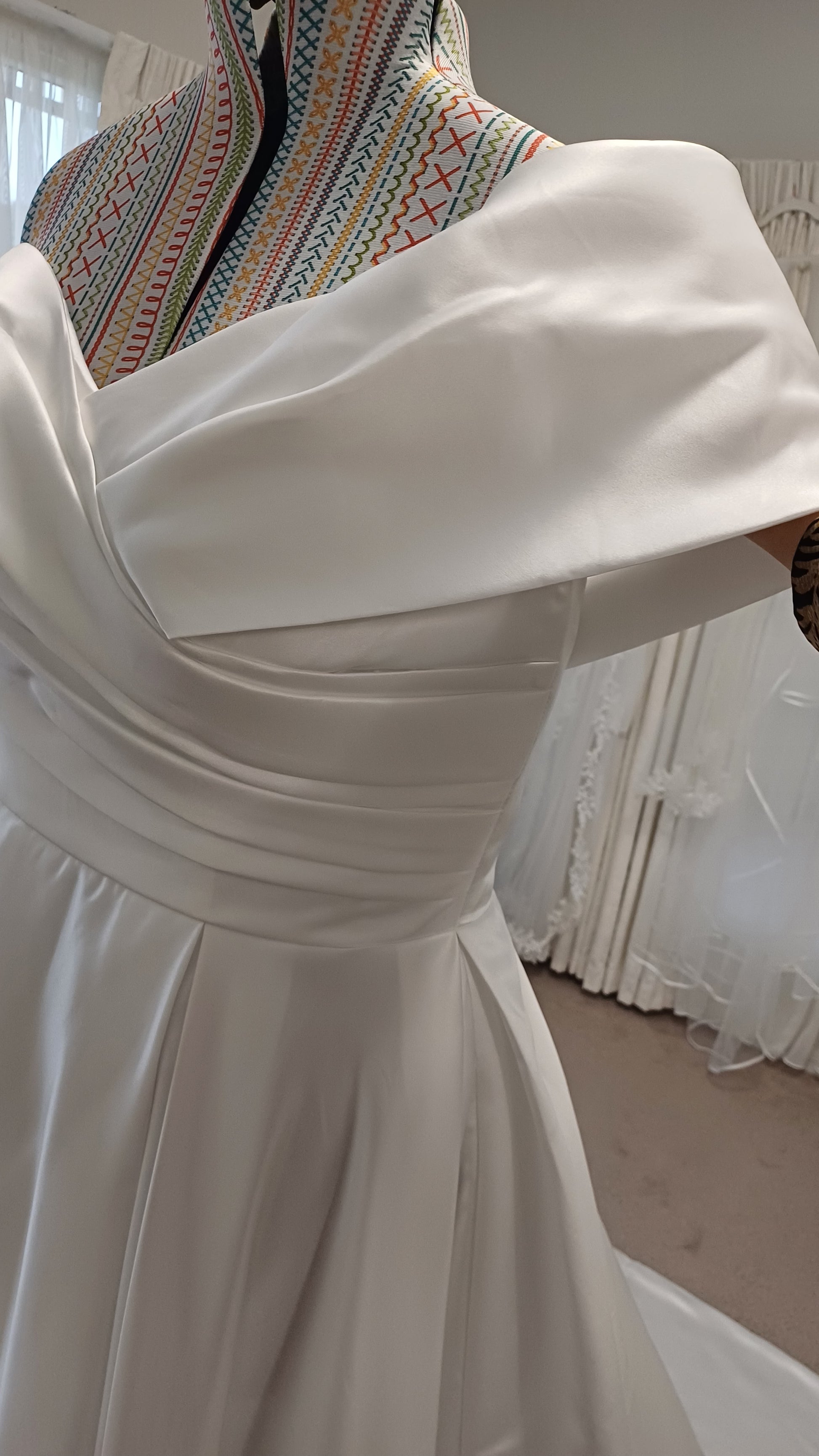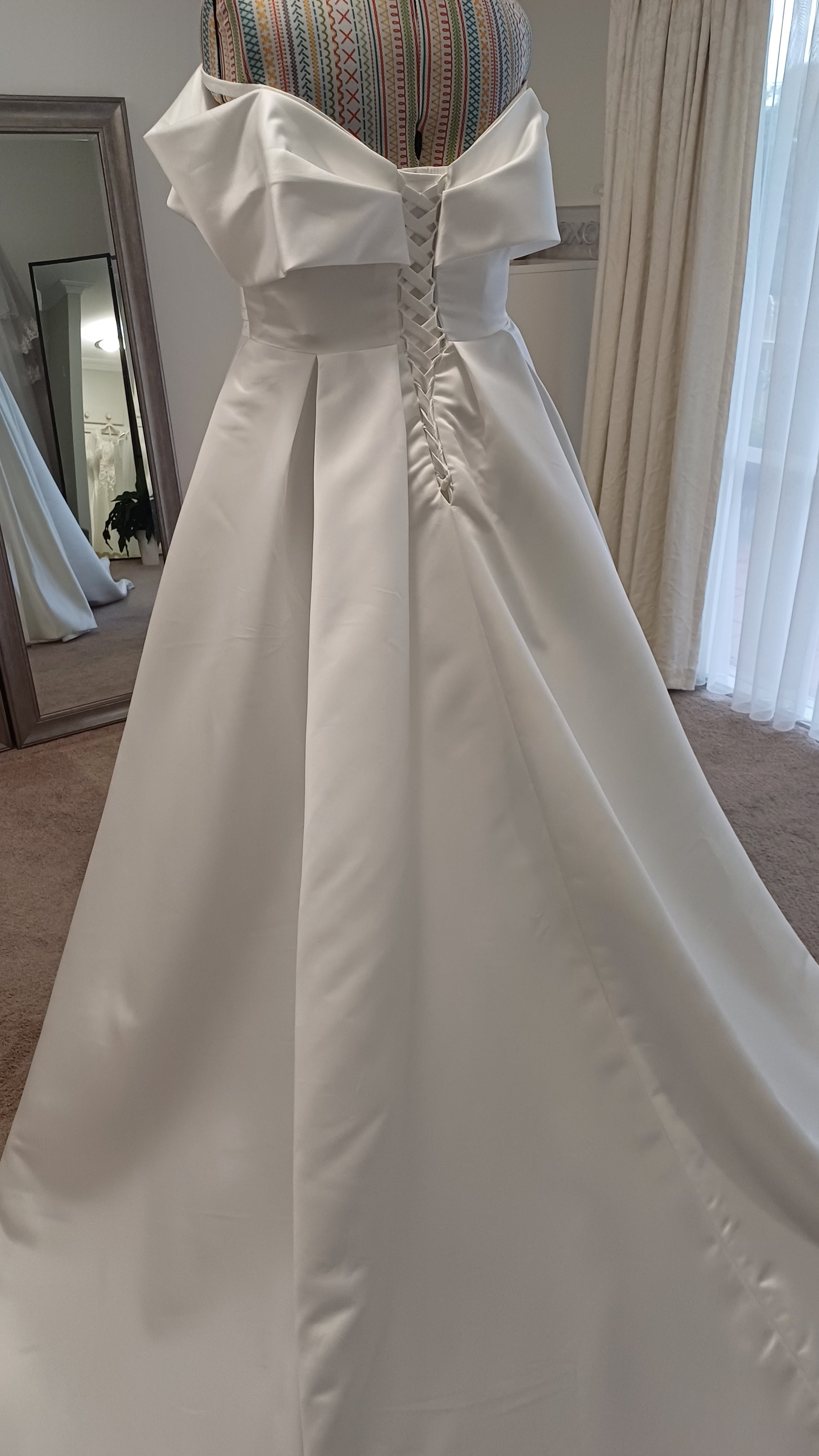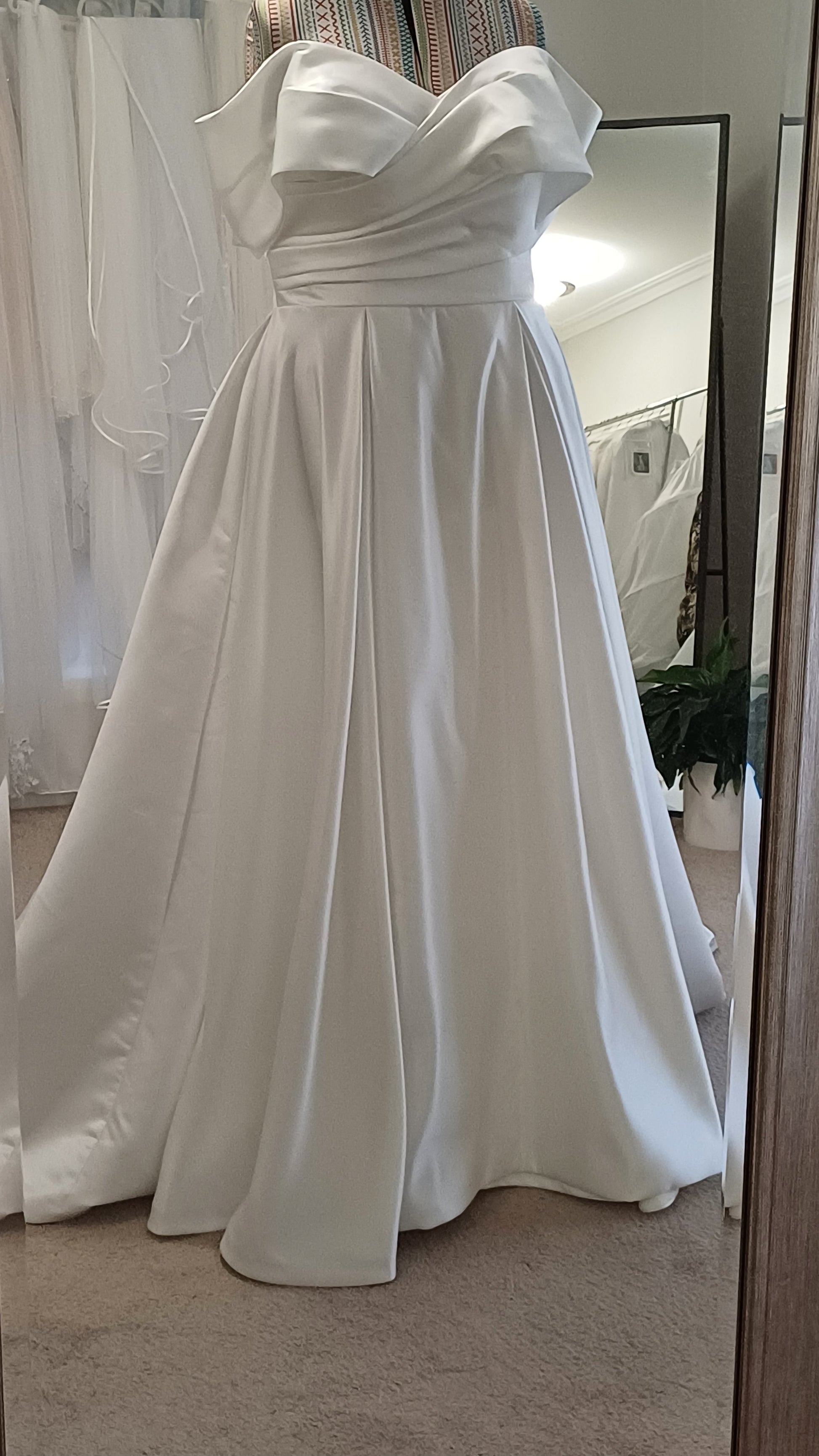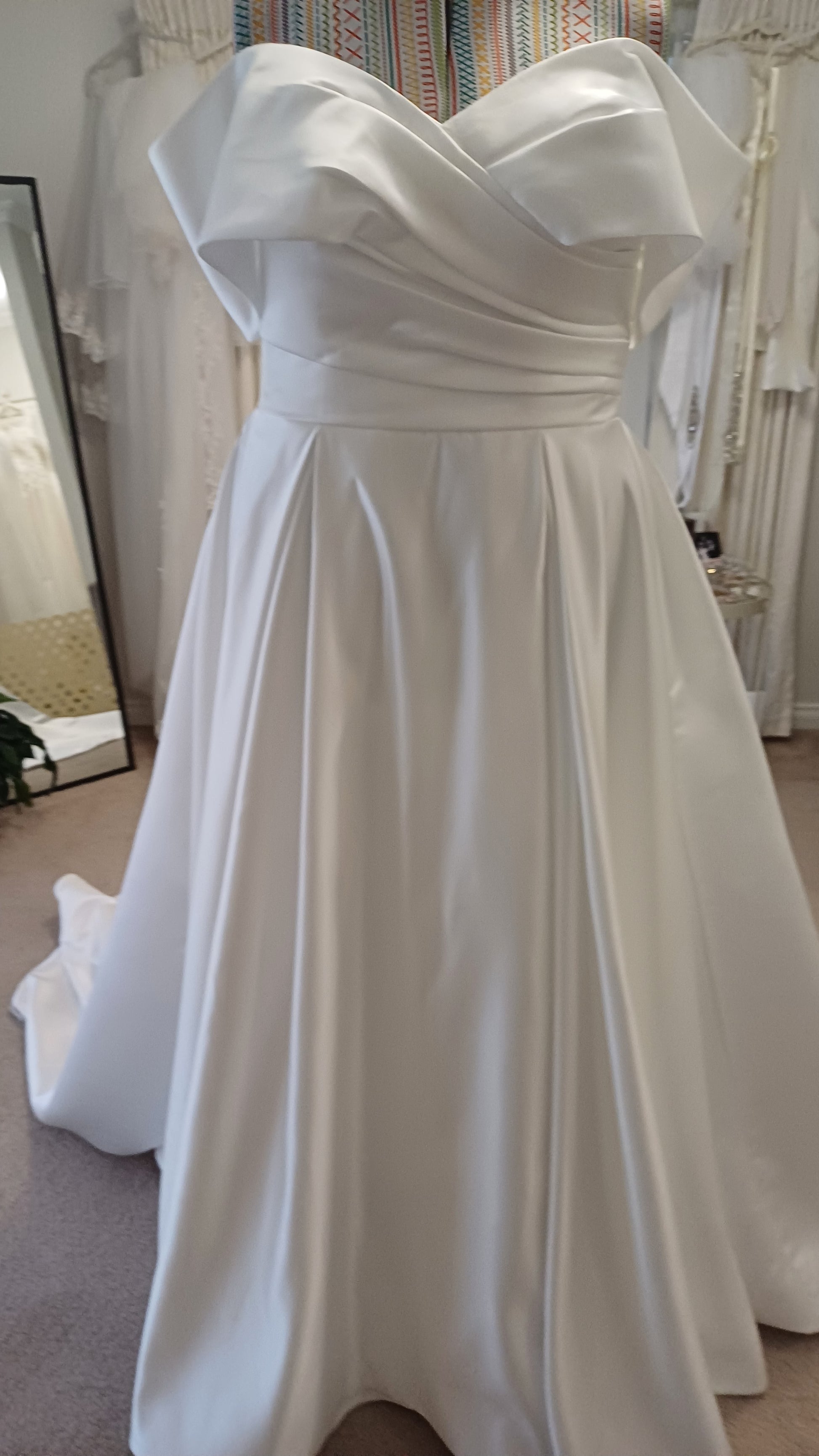 Becca's v-neck off-shoulder bodice with lace up (corset) back highlights you decolletage perfectly. The bodice pleating and pleated skirt are the perfect finish to her satin A-line silhouette. Her skirt is fully lined with a loop at the centre back seam to hold her up for all the dancing you will be doing.