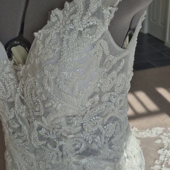 CHLOE is a dream. Her mermaid silhouette - crafted from beautiful bridal crepe - hugs your curves and the sequins and intricate beading glitter as you move. With a deep V front and back, boning and bust shaping, Chloe is designed to be remembered. Her absolutely stunning lace train is the finishing touch on a dress that will create a storm.