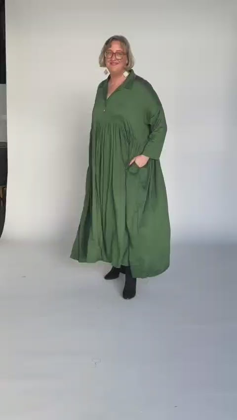 The Indian Summer Maxi Dress is crafted from soft, light silk-like fabric. She has a full collar, button through bodice and - drum roll please - POCKETS!