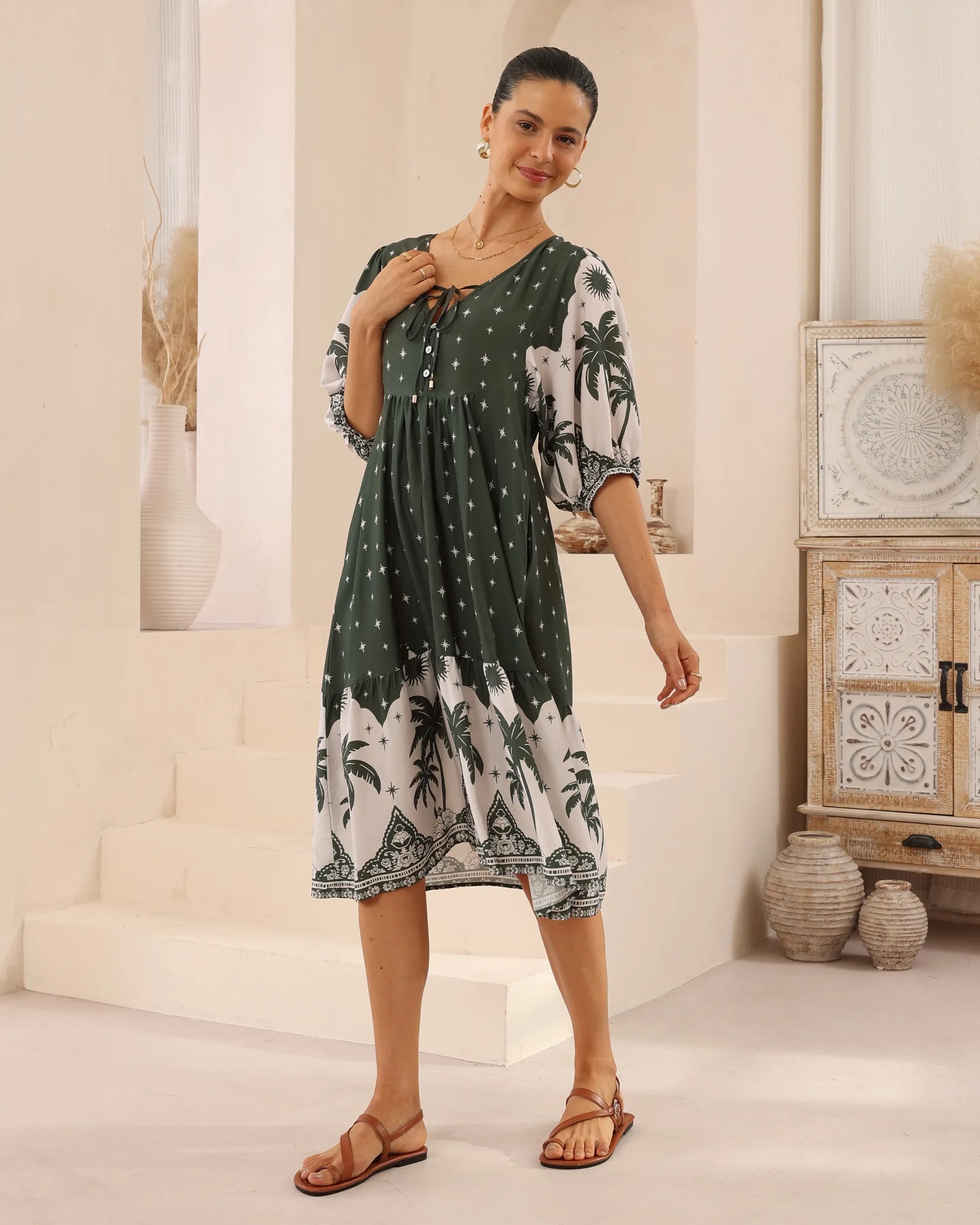 The Oasis midi dress is available in two colourways ... Olive or Sky with the placement print hem a feature