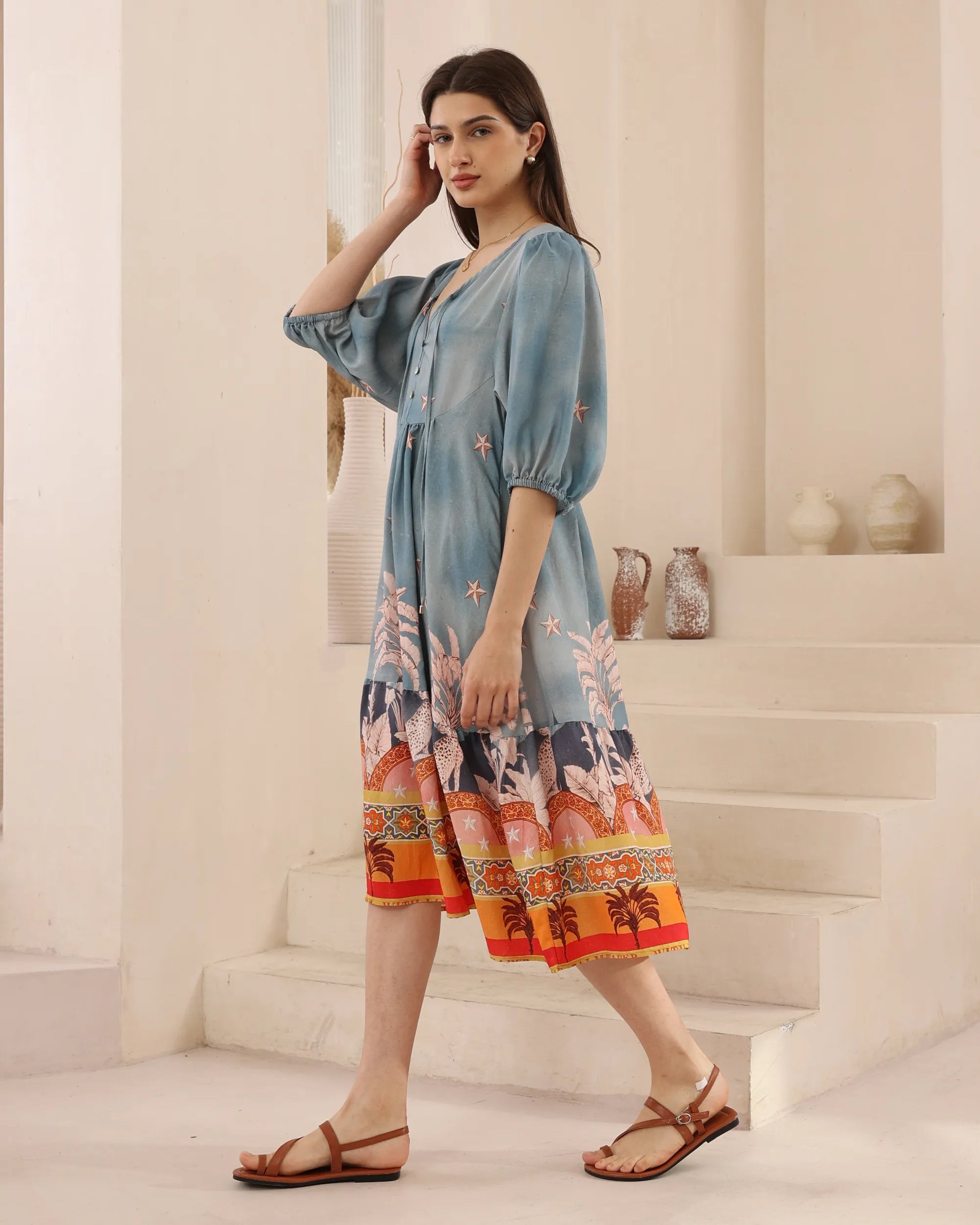 The Oasis midi dress is available in two colourways ... Sky or Olive with the placement print hem a feature