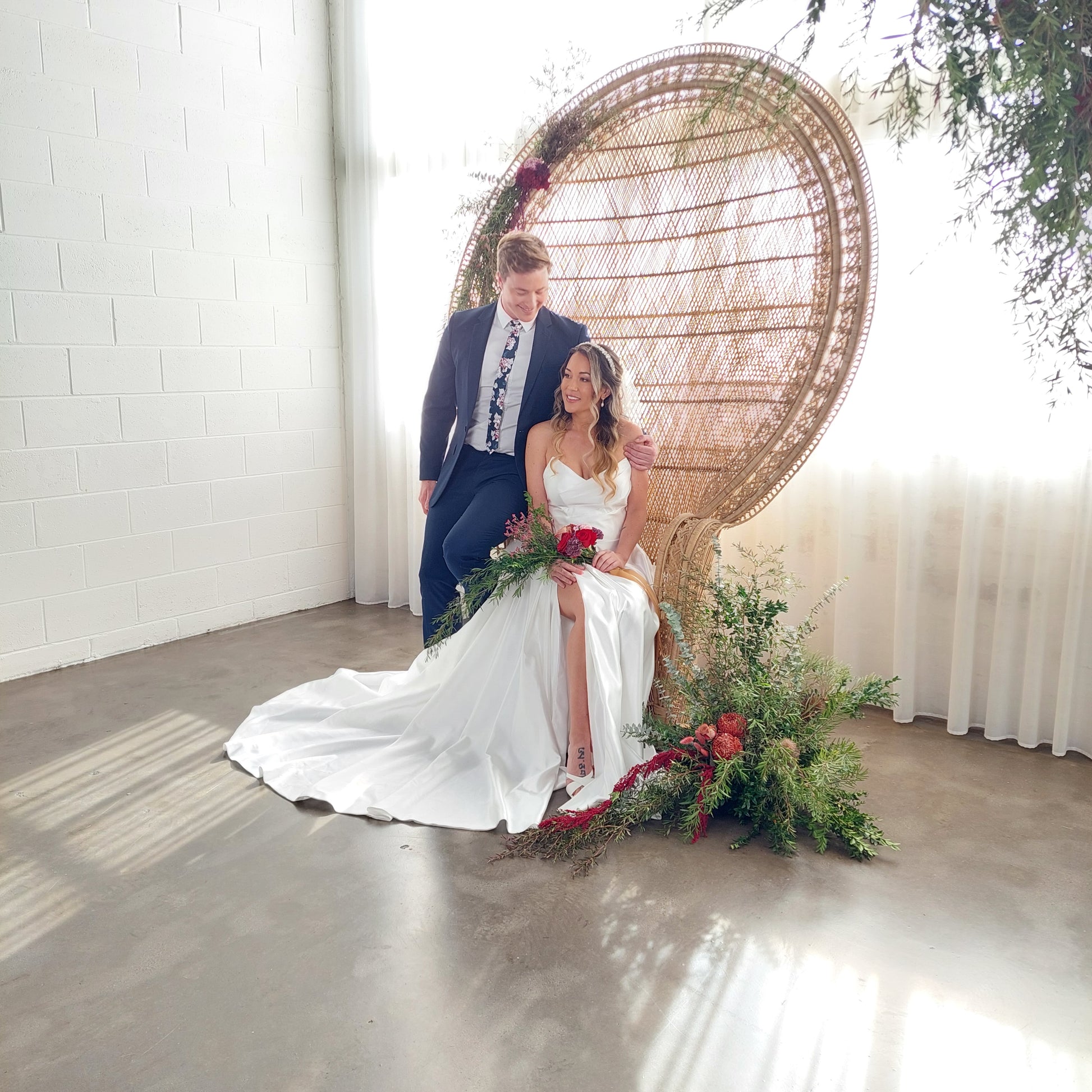She is constructed from fully lined heavy-weight satin with a sneaky leg split under those gorgeous petal pleats. Ruby's bodice is finished with diagonal folds across a faux cross-over shaped V-neck.