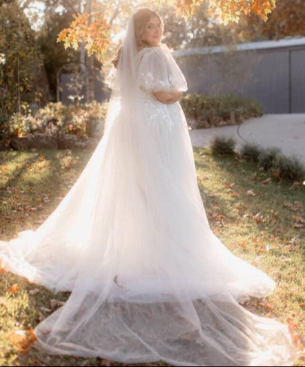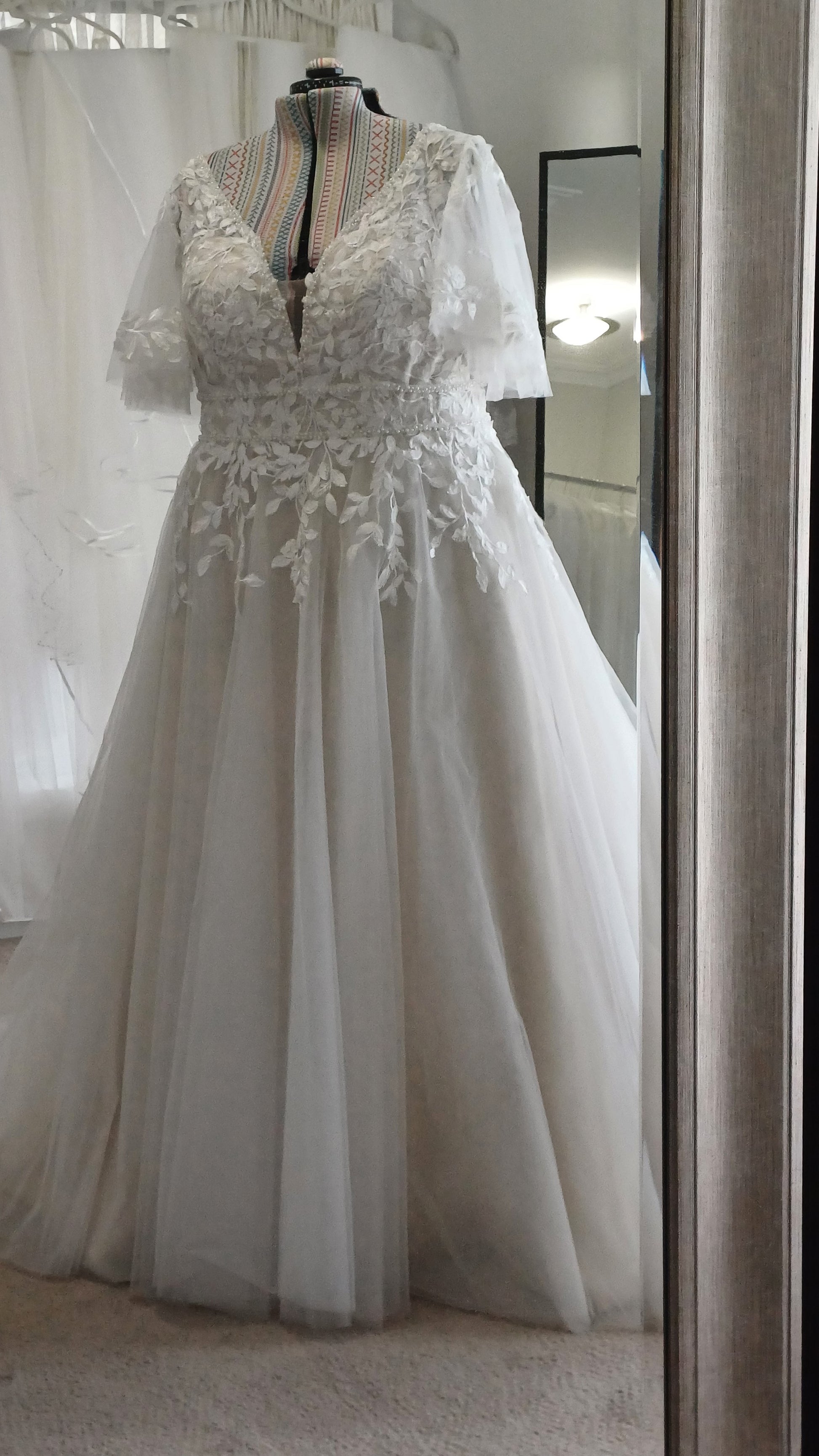 The soft tulle flutter sleeves provide some upper arm coverage and her V-back is finished with a row of satin covered buttons to the hem.